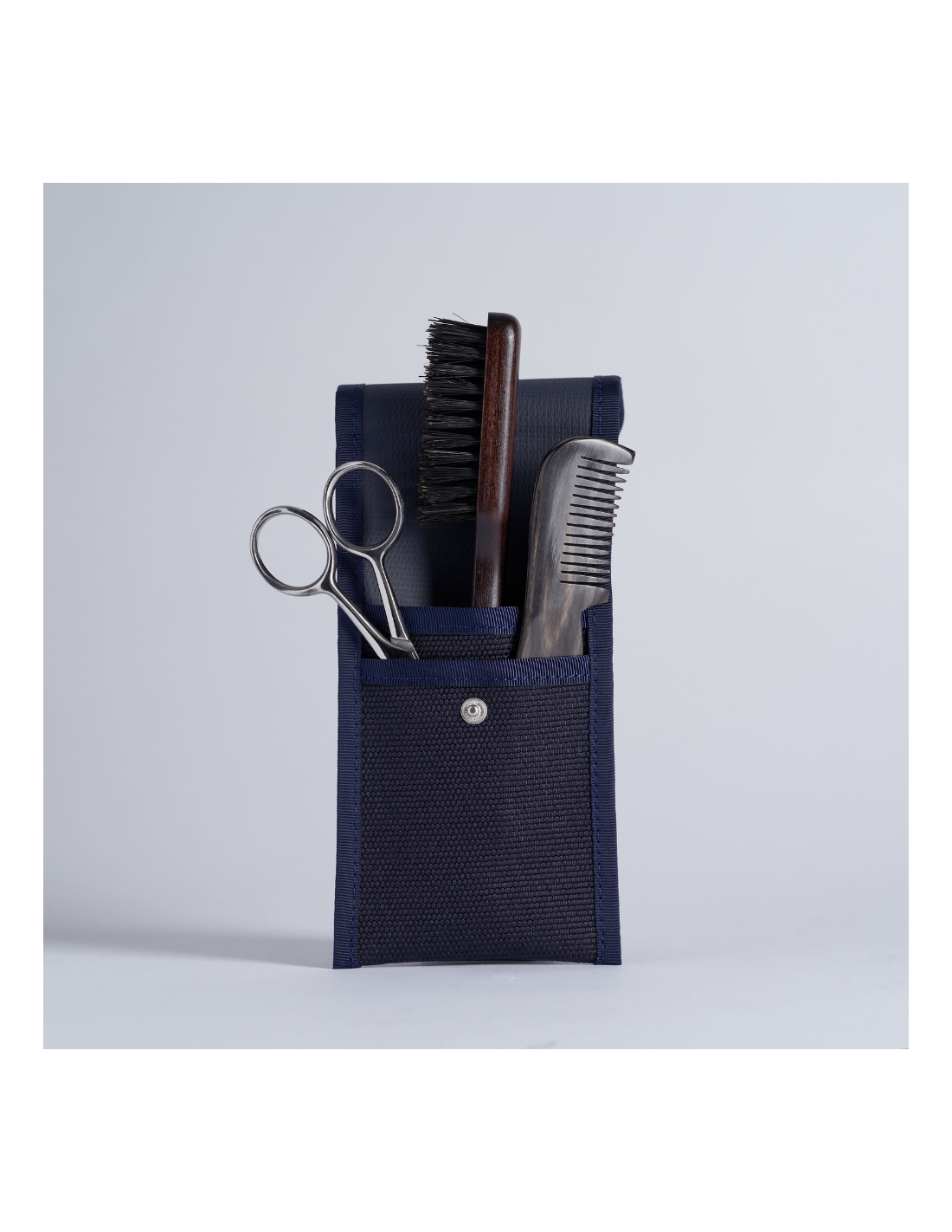 Utiliza el peine negro para alisar y disciplinar tu cabello pasándolo suavemente desde las raíces hasta las puntas. Luego, usa el cepillo de cerdas de jabalí en el cabello seco, cepillando desde el cuero cabelludo hasta las puntas para nutrirlo y darle brillo y suavidad. Finalmente, emplea las tijeras de acero inoxidable para estructurar y afinar los detalles de tu barba o bigote haciendo cortes pequeños y precisos para conseguir la forma deseada.