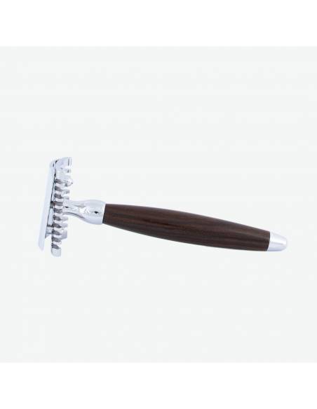 Maquinilla de afeitar en ébano y acabado cromado. Peine abierto o cerrado.