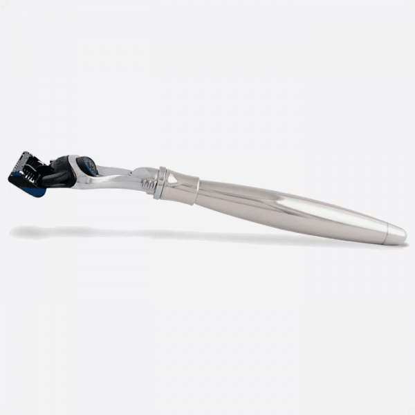 Elegante maquinilla de afeitar de latón macizo con revestimiento de paladio y acabado "Mirror". Diseño ergonómico y equilibrado. Disponible con 3 tipos de cabezales a elegir: Gillette Tradition, Mach3 y Fusion. De fabricación francesa. Cepillo a juego disponible por separado.