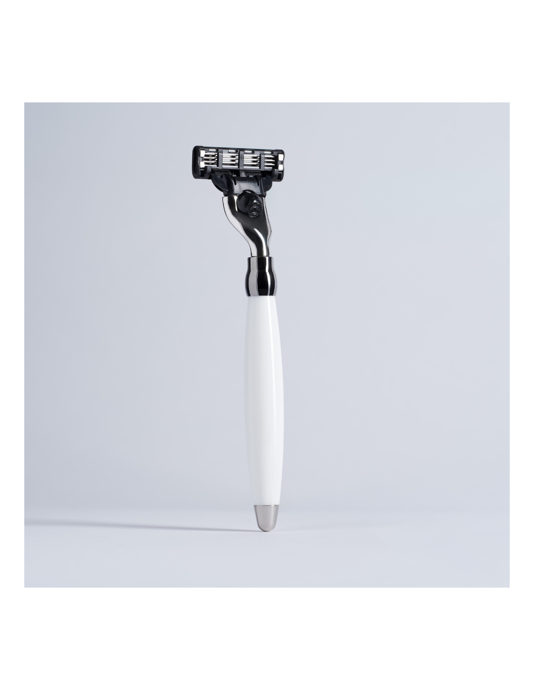 Una hermosa combinación de laca blanca brillante y latón cromado brillante. Un clásico de la gama Plisson. Disponible con cabezales Gillette mach3 y fusion o con el cabezal tradicional. Fabricada en Francia.