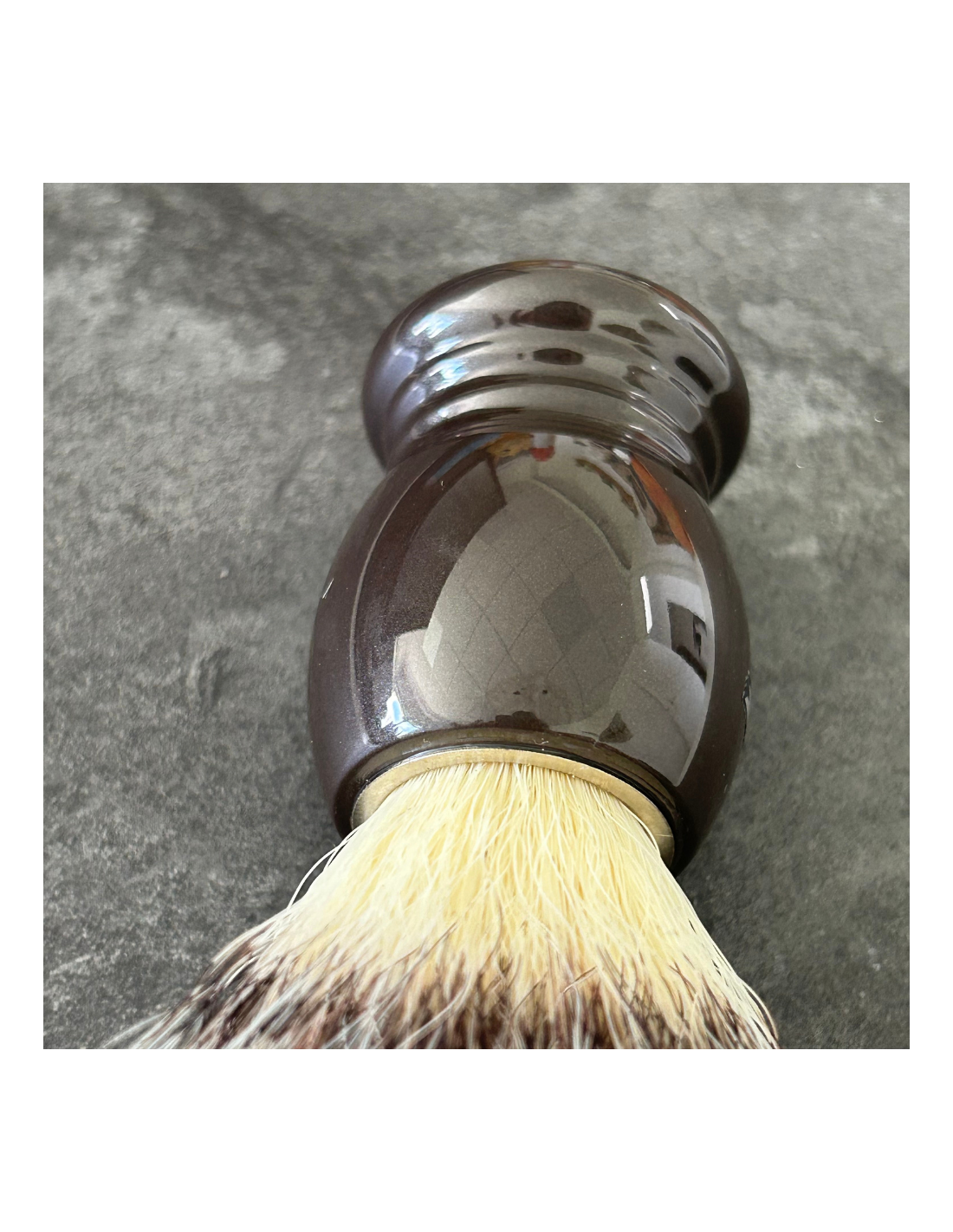 Brocha de fibra tipo «Blanc Haute Montagne». Conocida por su suavidad y flexibilidad, es la brocha más adecuada para pieles sensibles. Montada a mano y apta para el estilo de vida vegano.