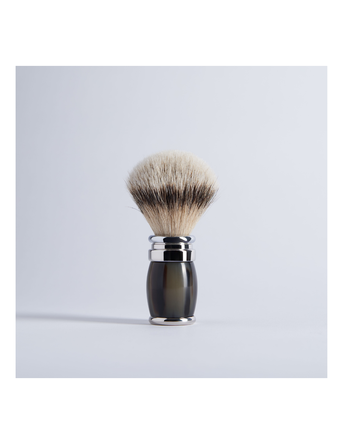 • Una brocha de afeitar de pelo natural, fabricada en cuerno y provista de nuestro pelo «Blanc Haute Montagne». Esta brocha está equipada con un penacho desmontable de tamaño 12 (estándar), perfecto para el uso diario. El pelo Blanc Haute Montagne es nuestra mejor calidad de penacho y es adecuado para las pieles más sensibles.