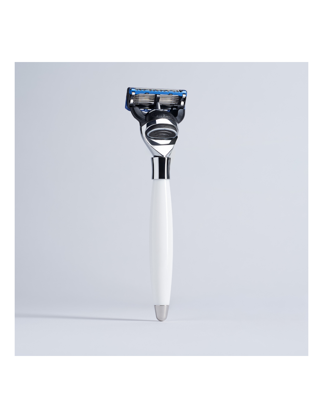 Magnífico set de tres piezas en laca blanca. Este set incluye una maquinilla de afeitar compatible con cabezales Fusion, una brocha de afeitar con nudo de cerdas blancas High Mountain extraíble, todo presentado en un elegante soporte.