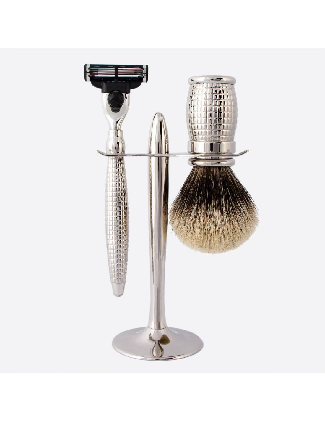 Un magnífico juego de afeitado de tres piezas. Una maquinilla de afeitar, una brocha a juego con motivos en forma de diamantes y acabado en paladio, y un precioso soporte. Una auténtica composición de prestigio para un cuarto de baño excepcional.