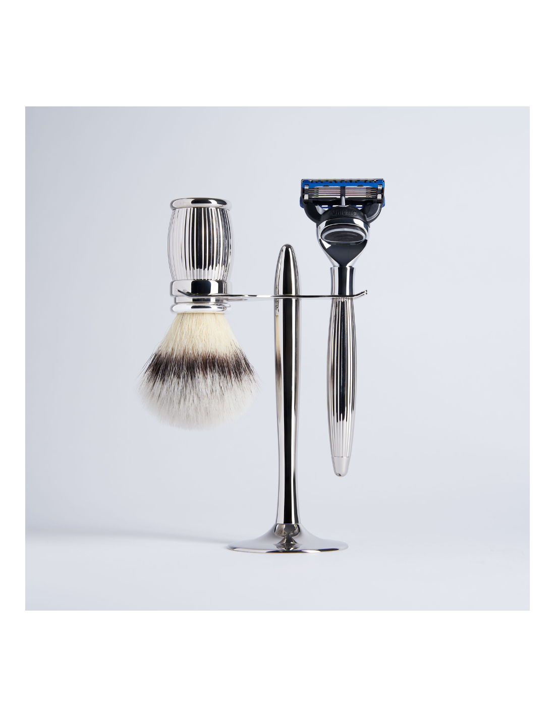 Lujoso set de afeitado compuesto por una maquinilla y una brocha de latón macizo con acabado de paladio, junto con su soporte. Una maquinilla de líneas elegantes y una brocha de afeitado provista de un mechón extraíble de tamaño 12 de fibra «Blanc de Haute Montagne», ideal para las pieles más delicadas, todo ello presentado en un magnífico soporte. Una composición excepcional para aportar un toque de elegancia al cuarto de baño del hombre moderno.
