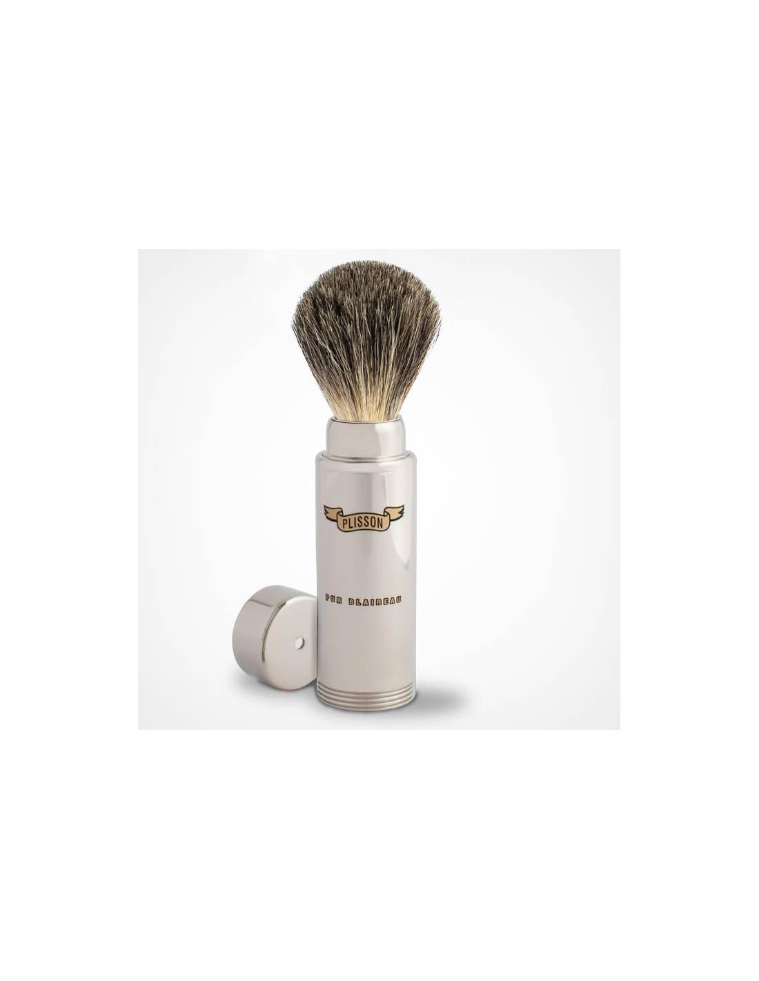 Très pratique blaireau de voyage en cuivre nickelé, rétractable, garni en pur blaireau, souple et doux. Taille unique (6). Fabriqué en France.