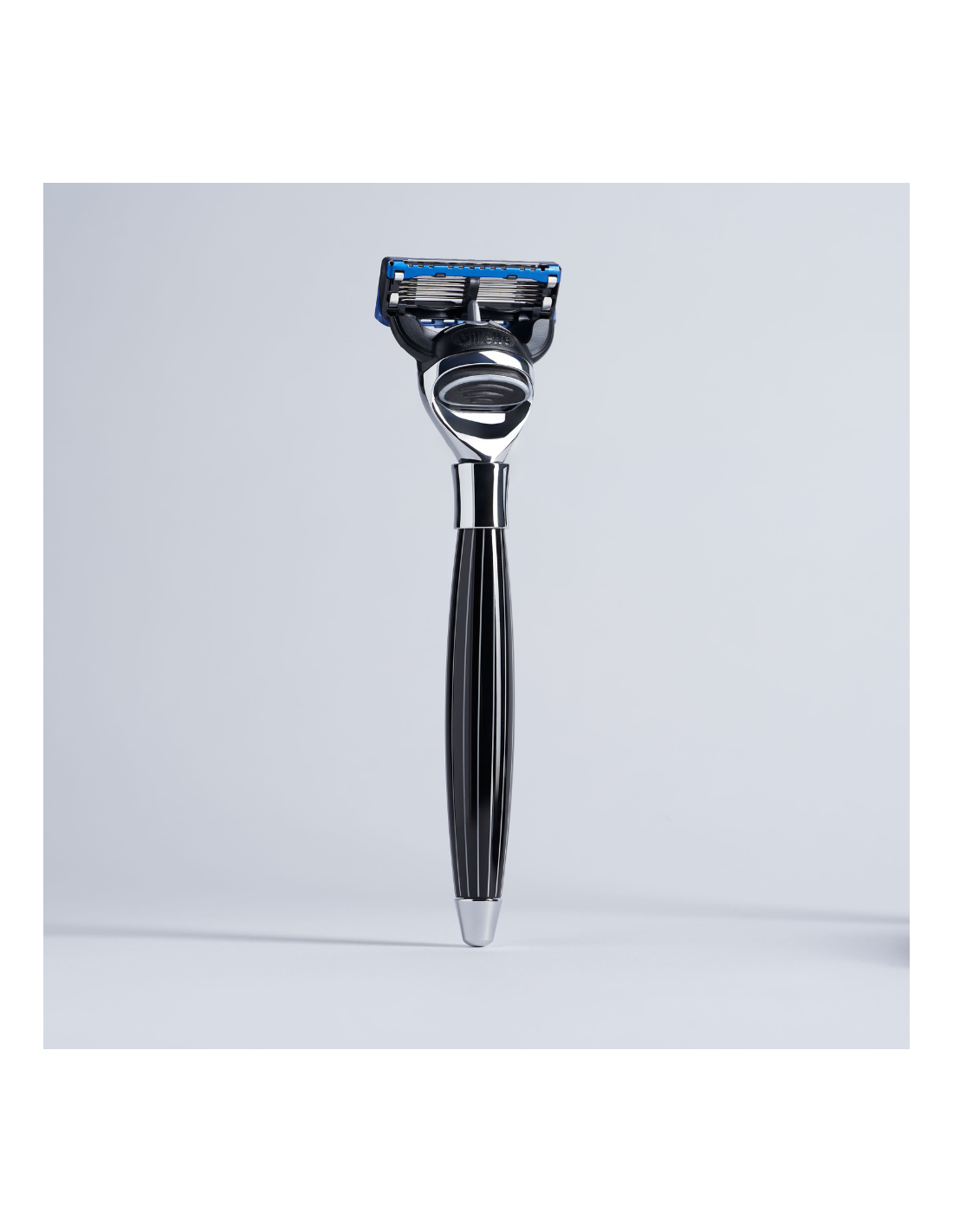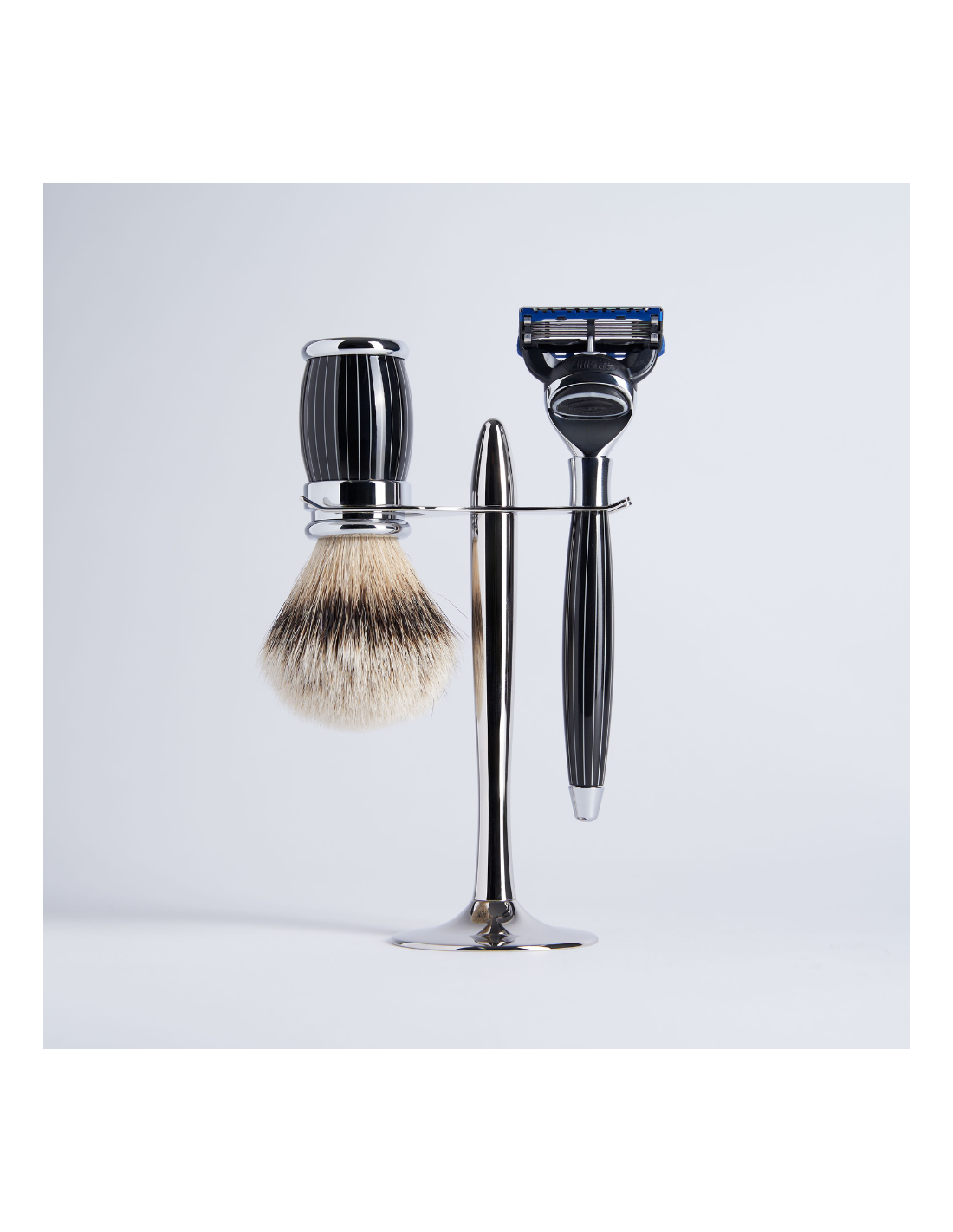 Prestigieux coffret composé de trois pièces en laiton massif avec une finition chrome. Ce set comprend un rasoir Fusion, un blaireau de rasage doté d'une touffe amovible réalisée avec notre poil Blanc Haute Montagne, le tout présenté sur un élégant serviteur. Offrez à votre salle de bain l'élégance du laqué rétro de la collection Joris, une collection intemporelle.
