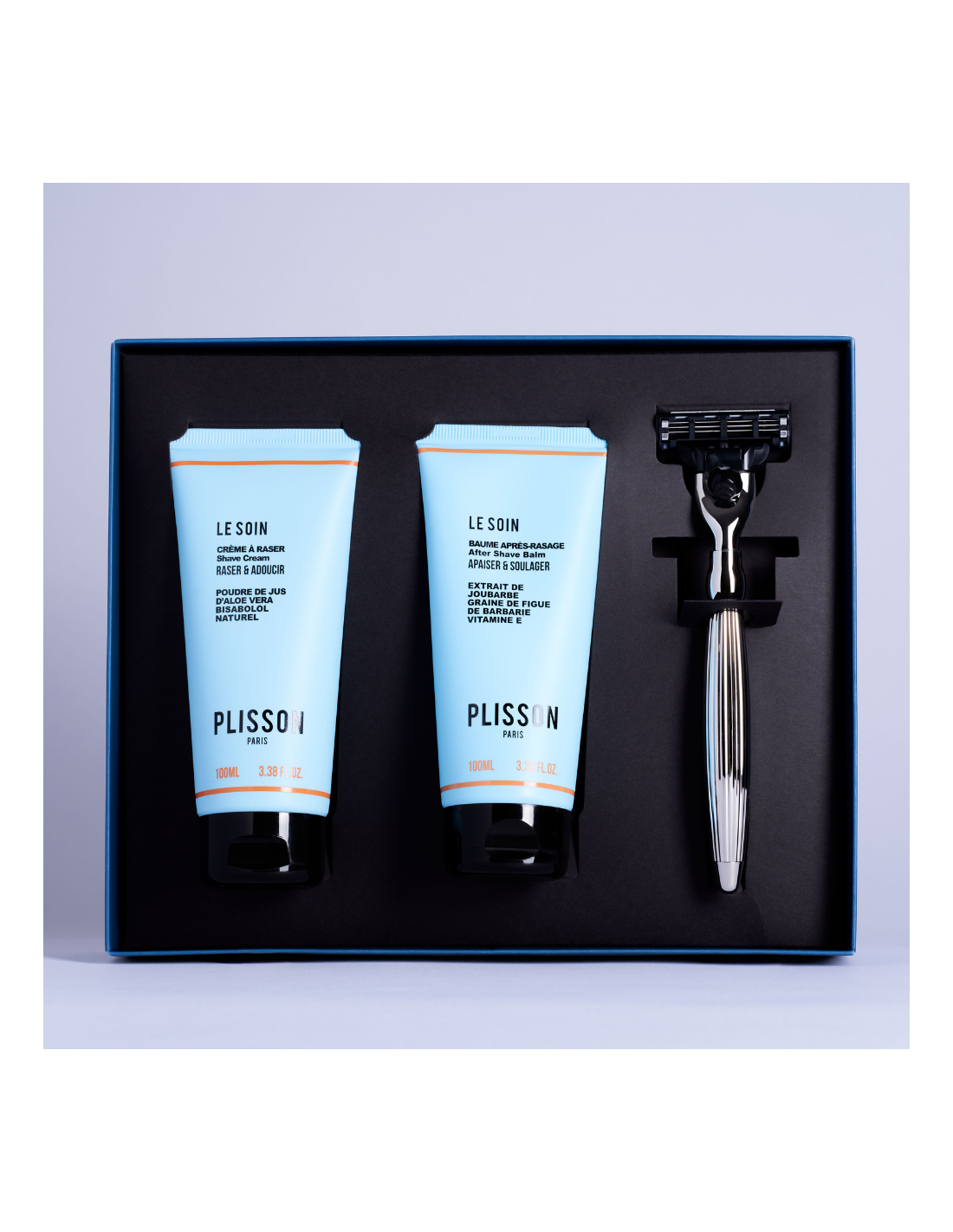 Retrouvez dans ce coffret cadeau Plisson le rituel d'un rasage parfait : une crème à raser et un baume après-rasage accompagné d'un rasoir Joris avec une finition Godron.