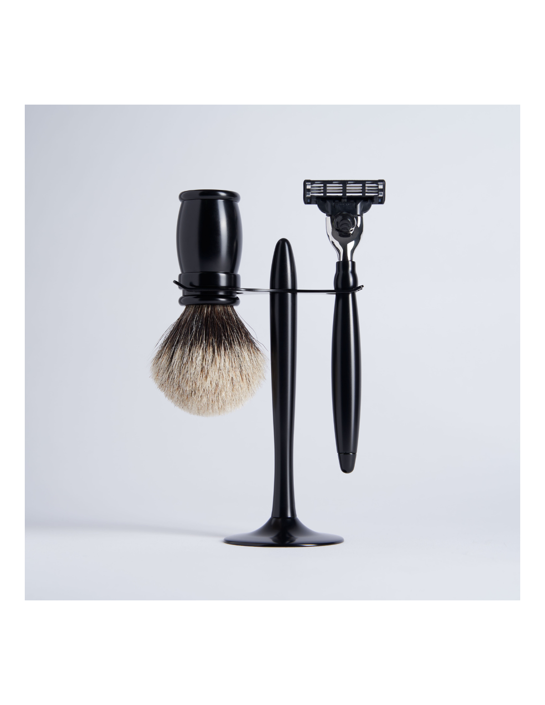 Prestigieux coffret constitué de 3 pièces en laiton massif finition noir infini. Ce set est composé d'un rasoir mach3, d'un blaireau de rasage garni d'une touffe amovible Gris Européen, le tout sur un élégant serviteur. Une touche d'élégance dans une salle de bain d'un gentleman.