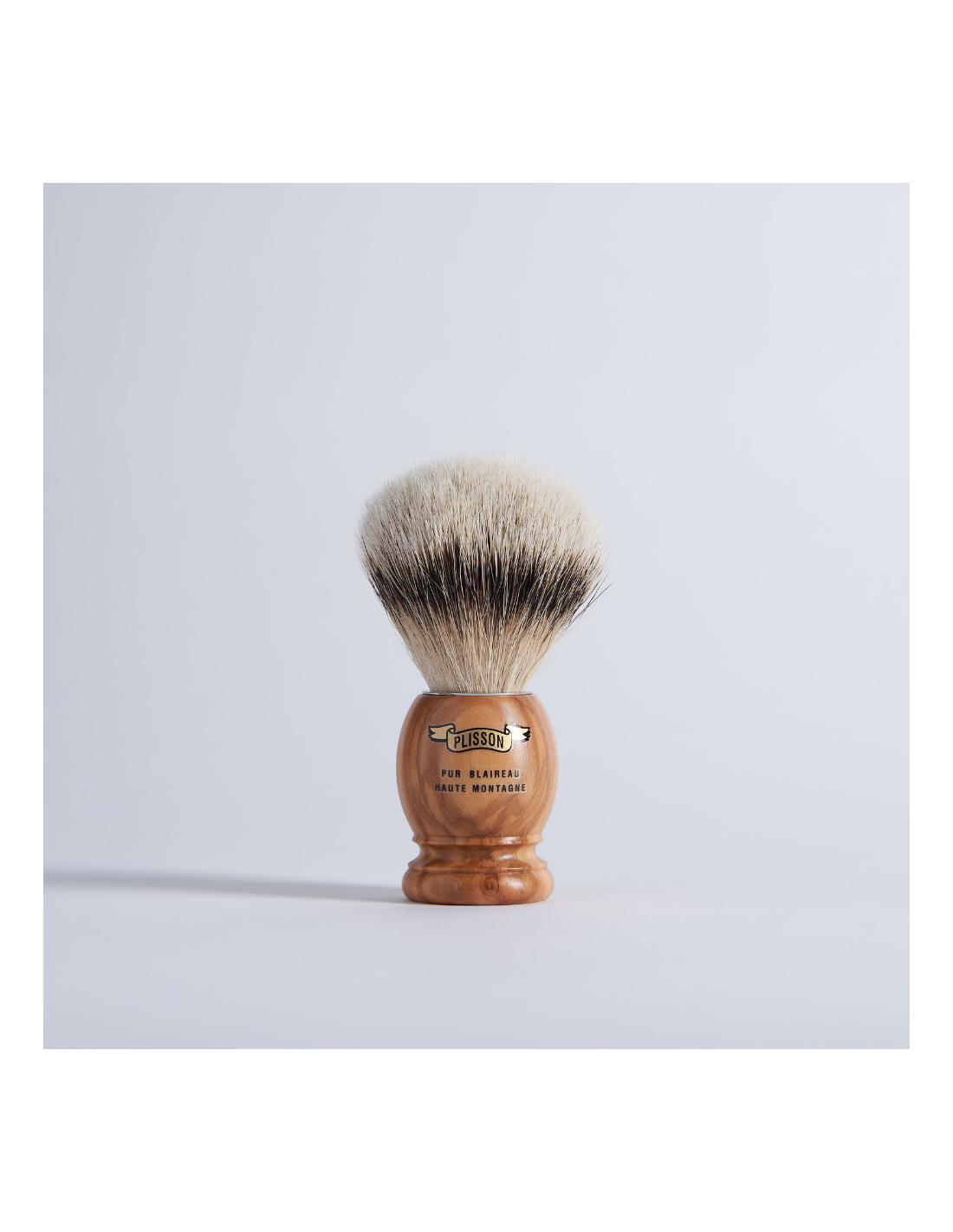 Blaireau en véritable poil Blanc Haute Montagne. Manche en bois d’olivier. Forme traditionnelle de Plisson, fabriqué entièrement à la main en France. Existe en petite, moyenne et grande taille.