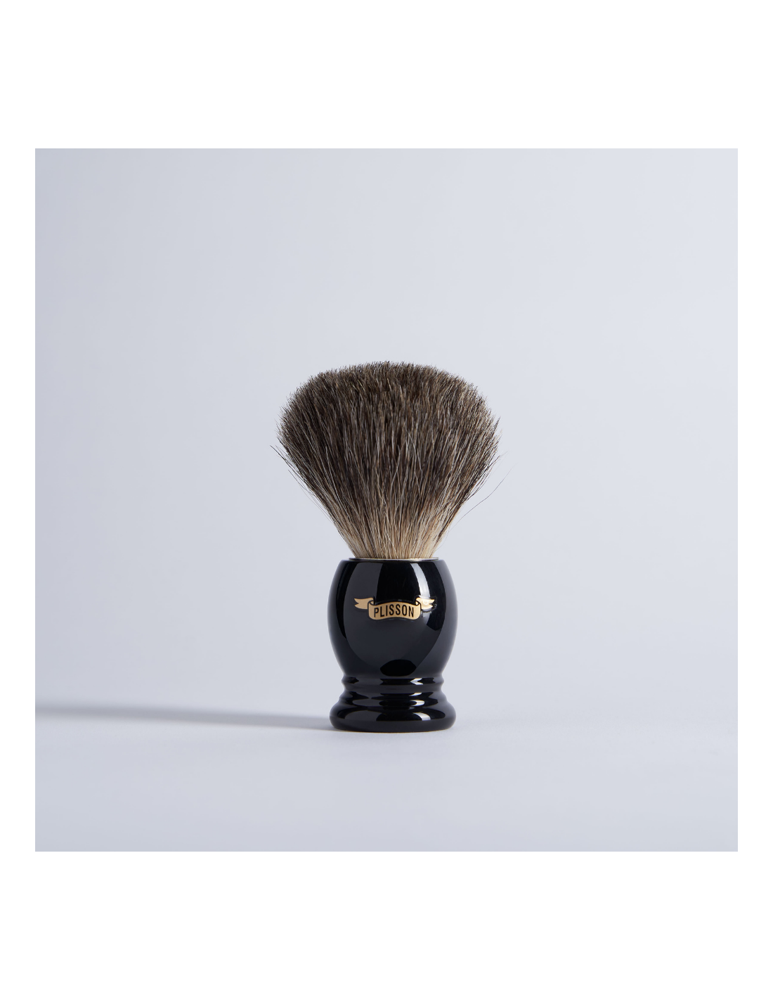 Magnifique blaireau en acétate noir brillant. Manche traditionnel, ergonomique. Garniture en pur blaireau gris de Russie. Fabriqué dans les ateliers Plisson en France.