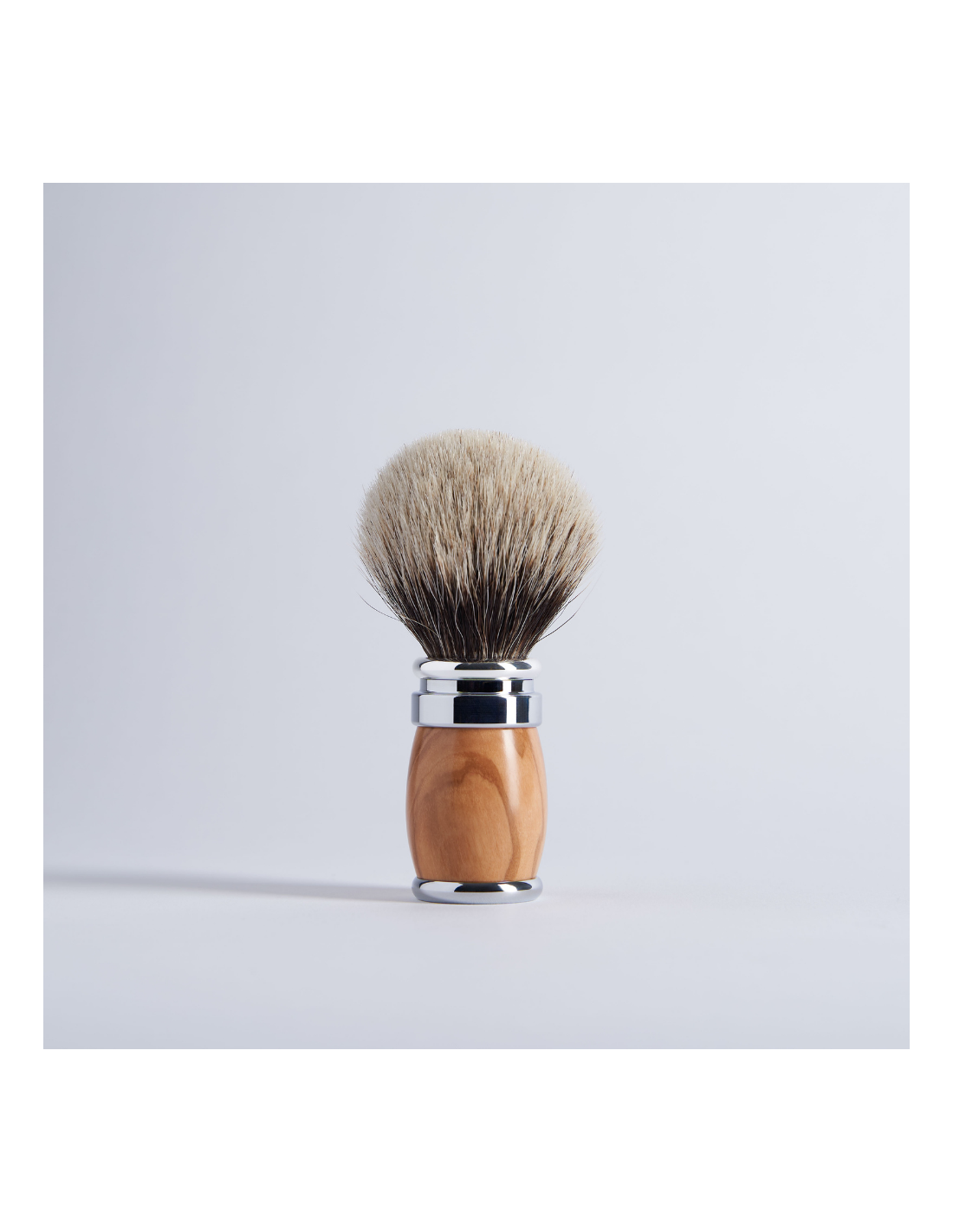 Assemblage Bois d'Olivier et laiton en finition Chrome. Manche proposé avec garniture amovible en pur blaireau Gris Européen. Taille 12 unique, idéale pour l’usage quotidien.
