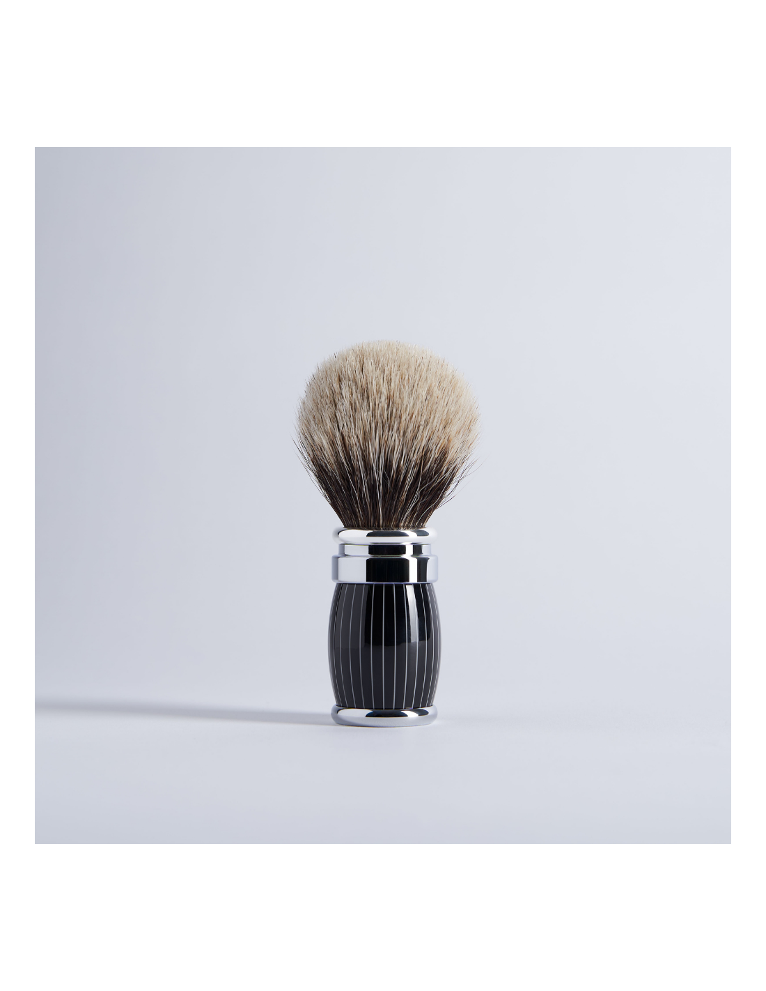 Superbe blaireau Gris Européen, laqué rétro et finition chrome de la collection Joris. Comme tous les autres modèles, celui-ci a une touffe dévissable, facilement changeable au besoin.