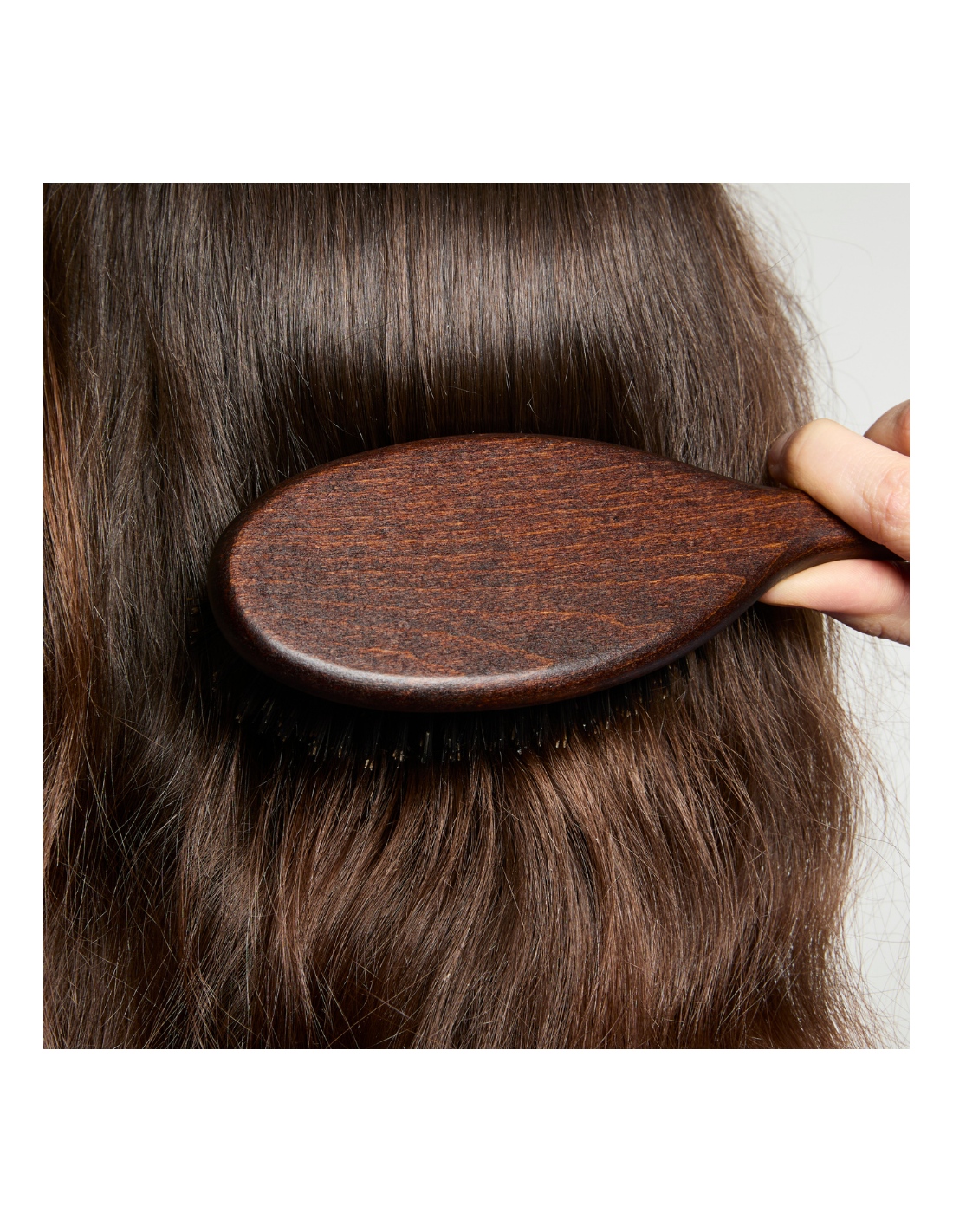 Cette brosse en poil de sanglier est fabriquée en France et ses finitions sont faites à la main.