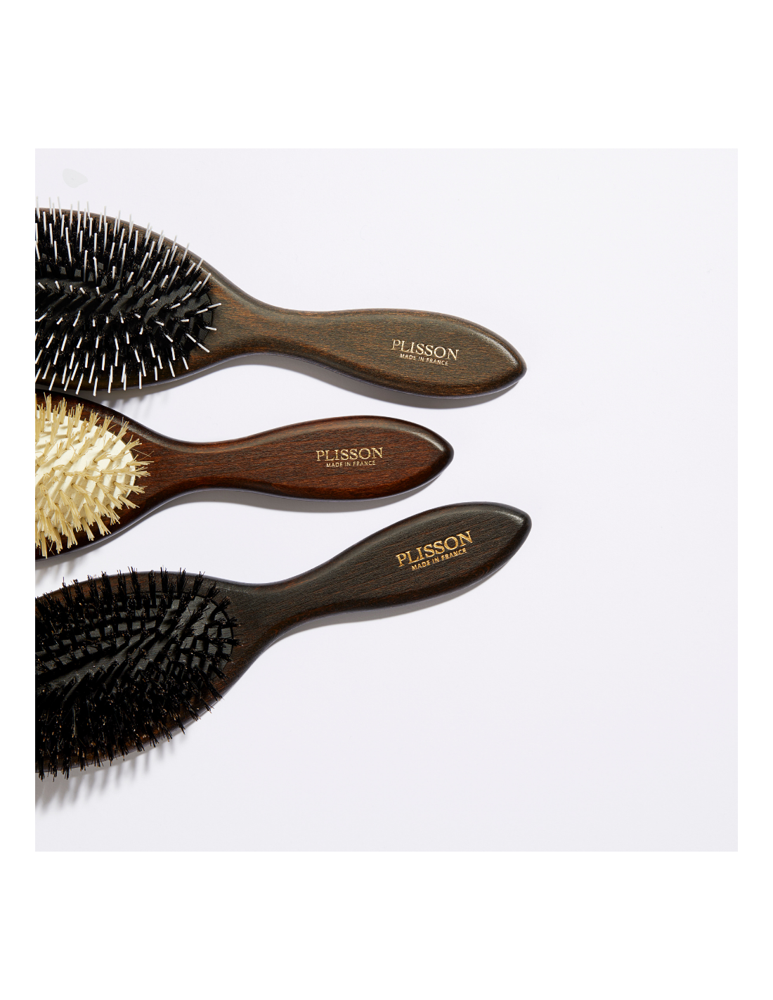 Adaptez la taille et le type de la brosse au caractère de votre chevelure : les brosses plus larges et plates sont adaptées plutôt aux cheveux longs, mi-longs ou épais, tandis que les brosses au diamètre plus petit seront préférables pour les cheveux plus fins et courts. Evitez d’utiliser la brosse sur les cheveux mouillés – ils seront plus fragiles et plus facile à casser. Pour un démêlage tout en douceur, commencez toujours par les pointes, et remontez progressivement vers les racines. Le poil de sanglier donnera douceur et brillance à vos cheveux au quotidien.