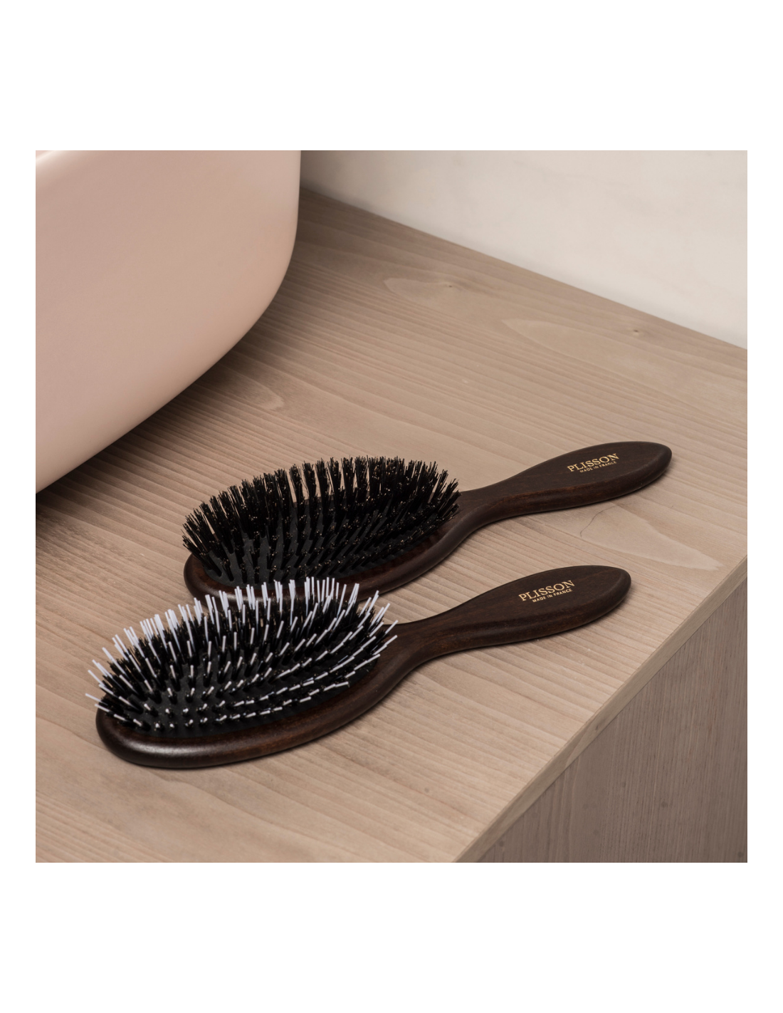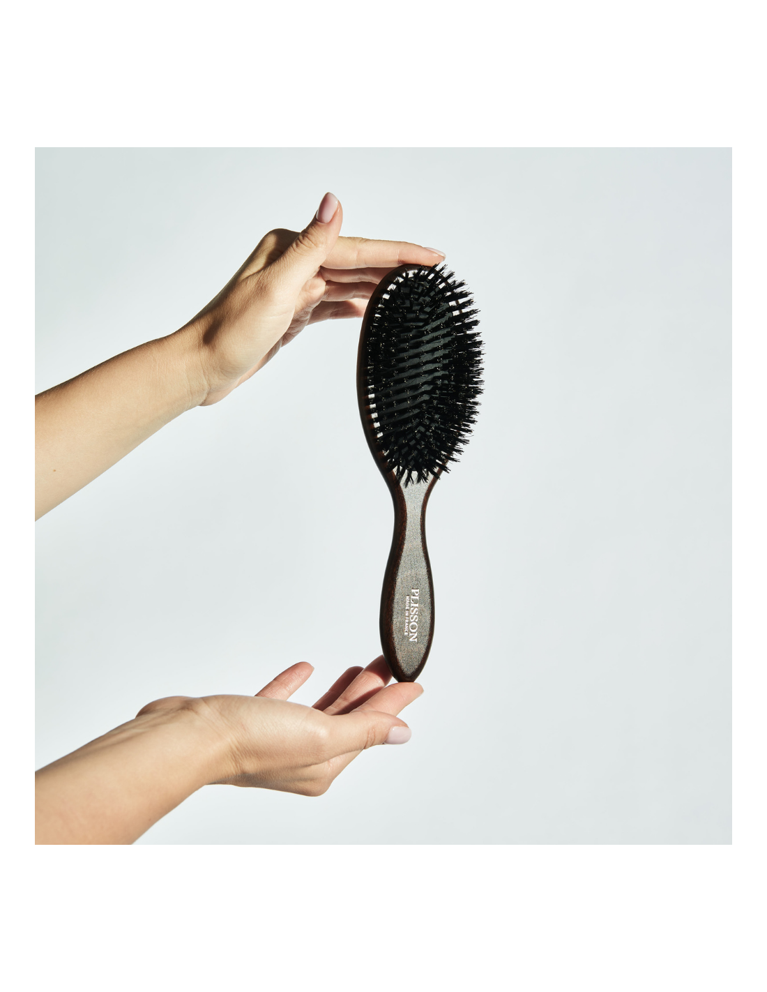 Magnifique brosse à cheveux pneumatique en véritable poils de sanglier antistatique montés sur une structure en bois européen. Grace au coussinet en latex naturel, la brosse s’adapte au relief de votre tête et autorégule la pression exercée sur votre cuir chevelu. Les poils du sanglier ont la particularité d’absorber les impuretés et le surplus de gras naturel des cheveux. La fermeté des racines des poils de sanglier contribue au massage stimulant de votre cuir chevelu, bénéfique pour la santé de vos cheveux. Le brossage deviendra un plaisir et vos cheveux retrouveront brillance et éclat.