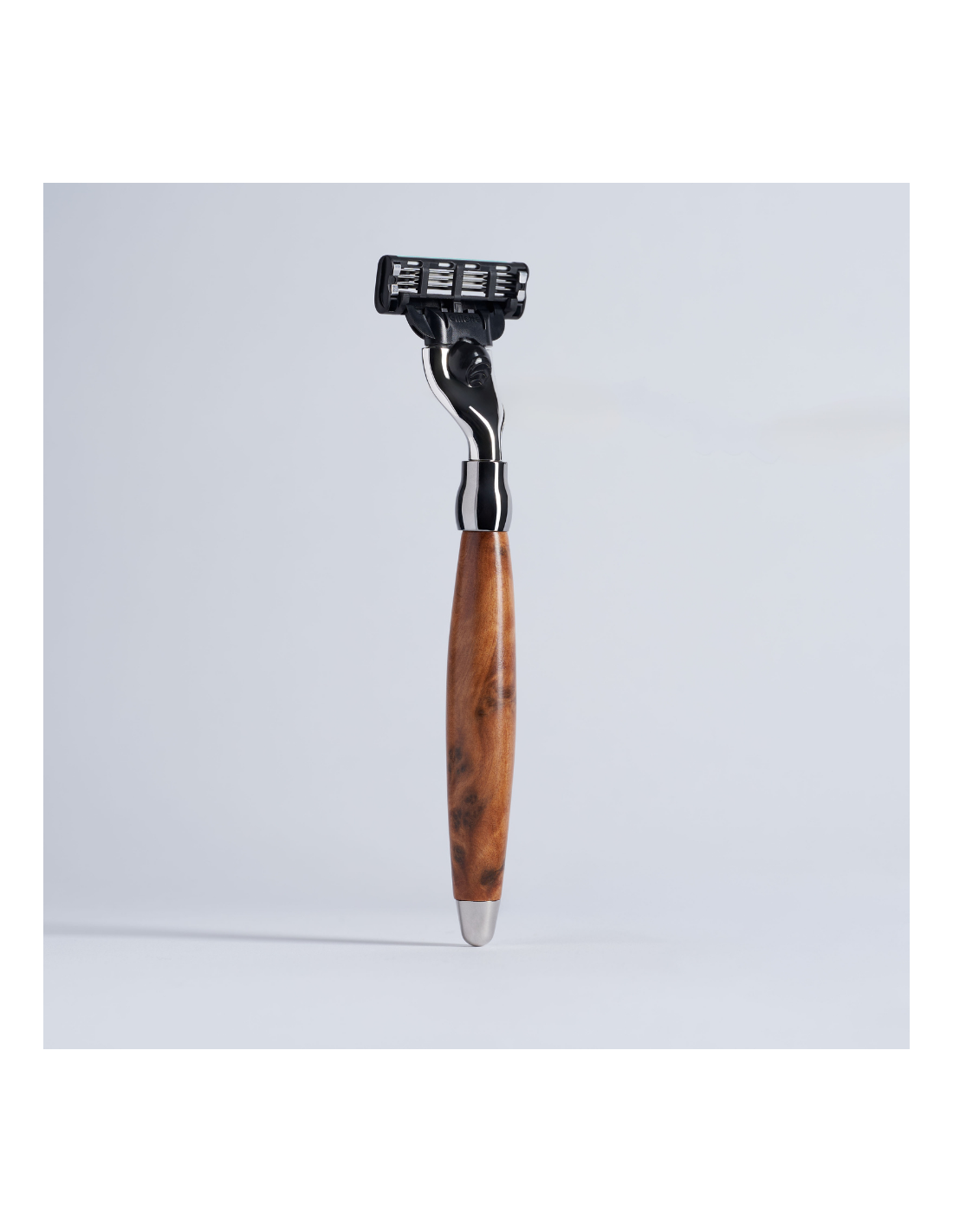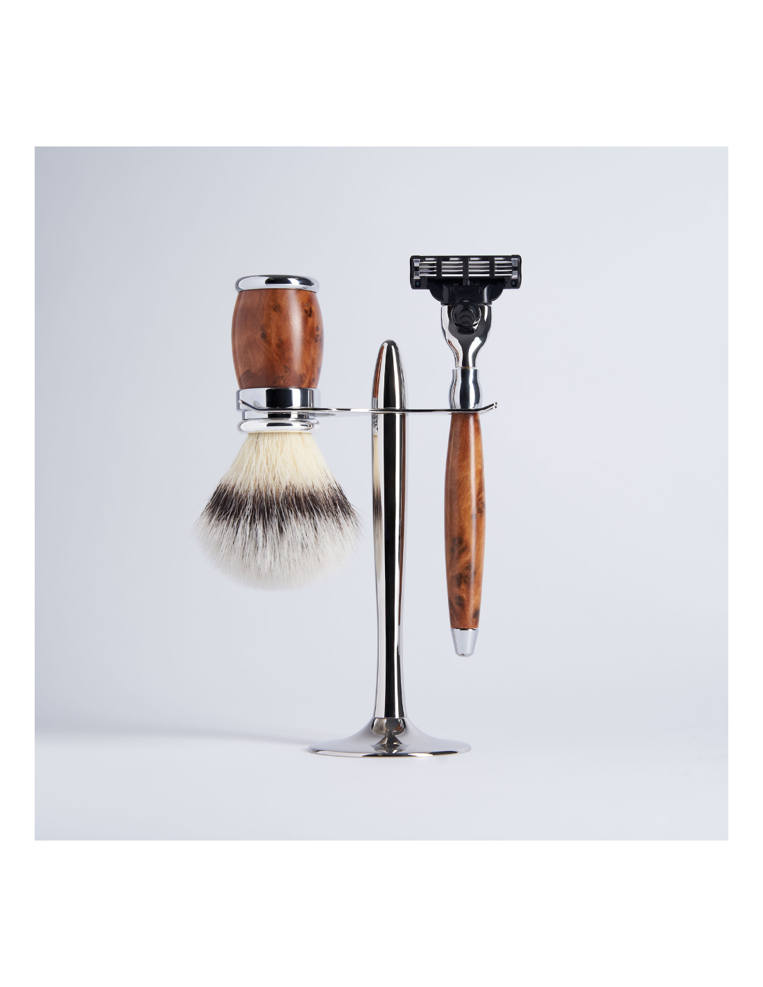 Prestigieux coffret de trois pièces en laiton massif, sublimé par une finition chromée élégante. Ce set comprend un rasoir Mach3, un blaireau de rasage doté d’une touffe amovible en poils synthétiques Plisson, le tout présenté sur un serviteur raffiné.