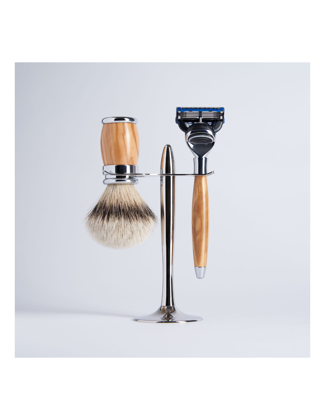 Un magnifique support en laiton massif avec une finition chrome, conçu pour présenter avec élégance le rasoir et le blaireau assortis.