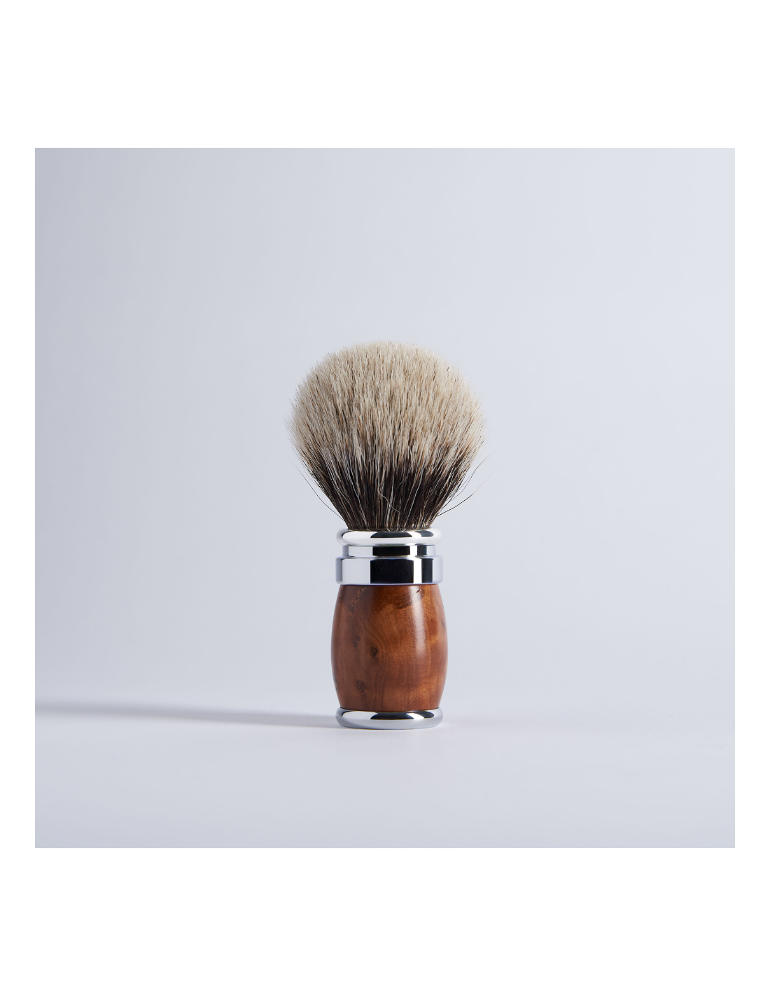 Belle association de bois de Thuya et de laiton en finition Palladium. Touffe à montage vissé. Proposé en pur blaireau noir, gris européen ou Blanc Haute Montagne. Taille unique (12). Fabrication française.