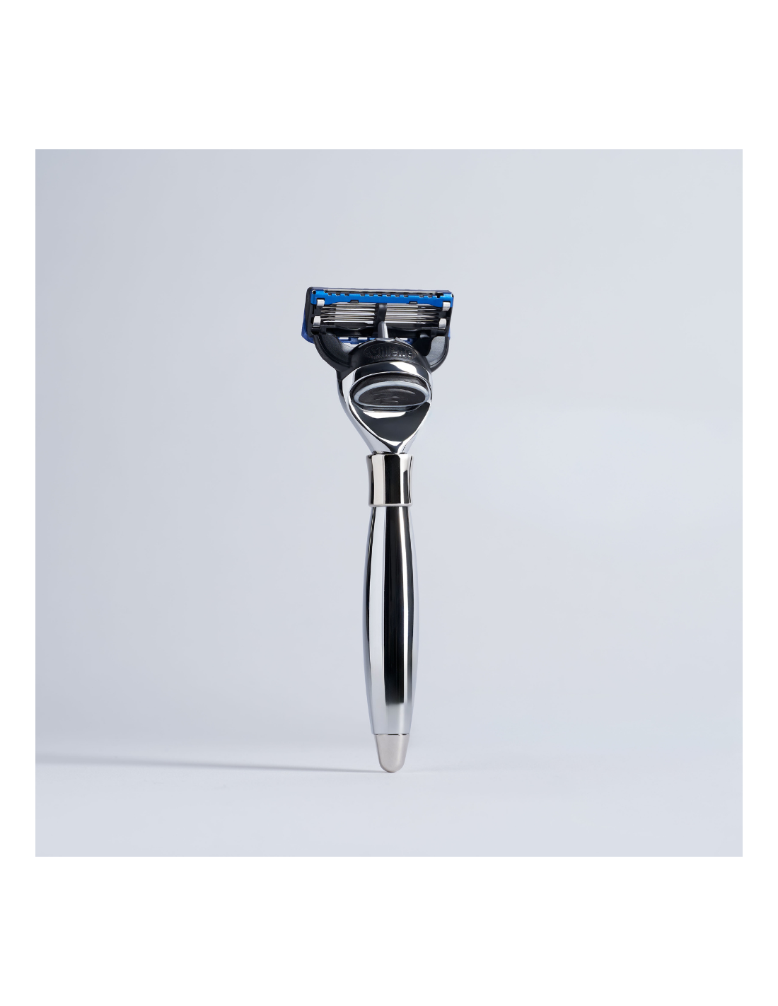 Rasoir de voyage en laiton massif finition Palladium. Equipé de la tête Fusion à 5 lames de Gillette, précise et sécurisante. Livré avec son étui de voyage en cuir. Fabriqué et assemblé en France.