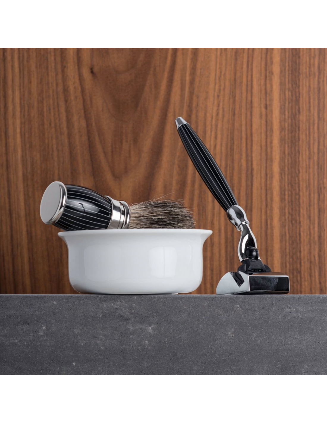 Préparez votre mousse à raser en chargeant le blaireau de savon ou de crème à raser. L'utilisation des produits dit de "Préparation au rasage" a un double objectif : amplifier l’hydratation du poil en le débarrassant de sa couche graisseuse (sébum) et protéger la peau de l'agression de la lame.Appliquez la mousse sur votre visage mouillé en faisant des mouvements circulaires, pour bien redresser les poils.