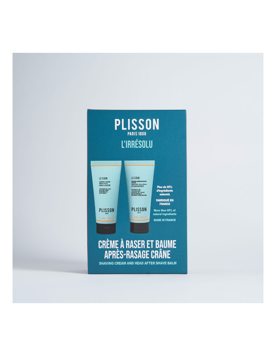 L'Irrésolu réunit une Crème à Raser et un Baume Après-Rasage pour le Crâne, deux soins complémentaires pour un rasage respectueux de la peau.