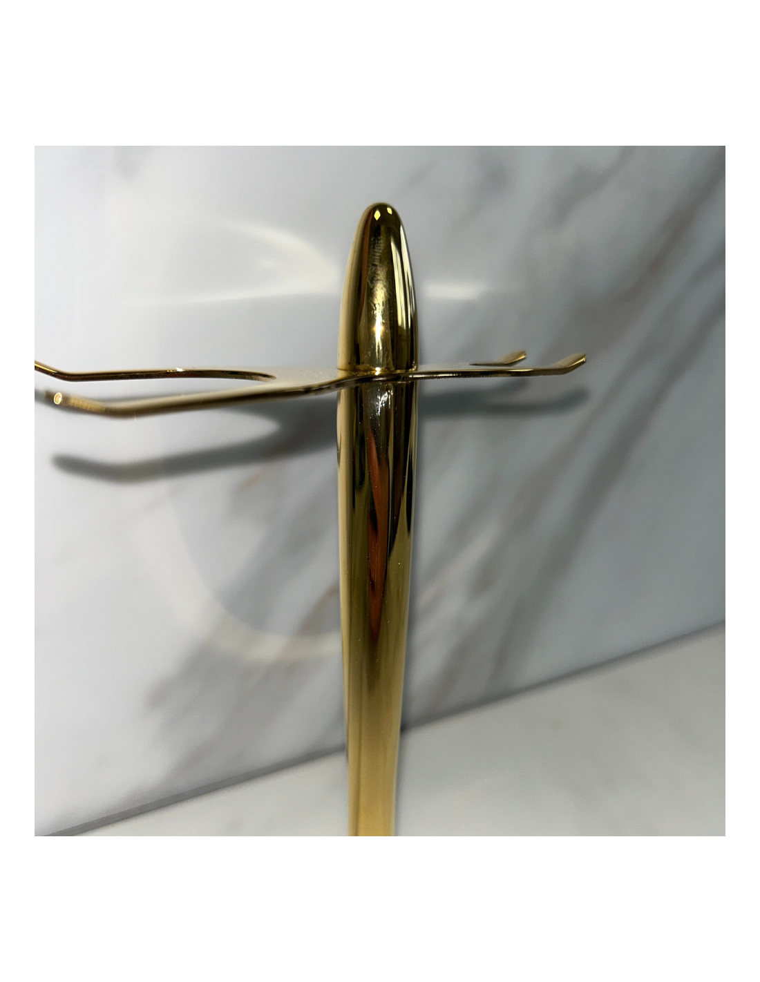 Magnifique serviteur Presque Parfait en laiton massif et finition Or 24 carats, accueillant avec élégance vos accessoires de rasage. Le grand crochet est conçu pour recevoir le blaireau de la taille 10 jusqu’à la taille 16 (diamètre de 20 – 24 mm), suspendu « Tête en bas ». Le petit crochet est compatible avec toute la gamme des rasoirs Plisson. Cet accessoire indispensable, stable et discret, assurera un rangement optimal de vos accessoires, tout en les mettant en valeur. Ce support a de légères rayures sur sa colonne, mais celles-ci n'altèrent en rien sa robustesse.