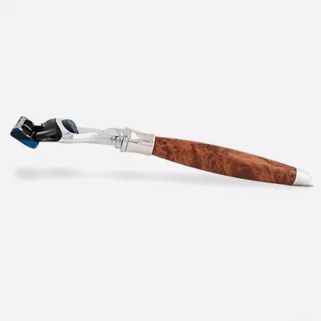 Magnifique rasoir en loupe de thuya et laiton finition chromé. Muni de tête Fusion à cinq lames de Gillette. Fabriqué dans les ateliers Plisson en France.