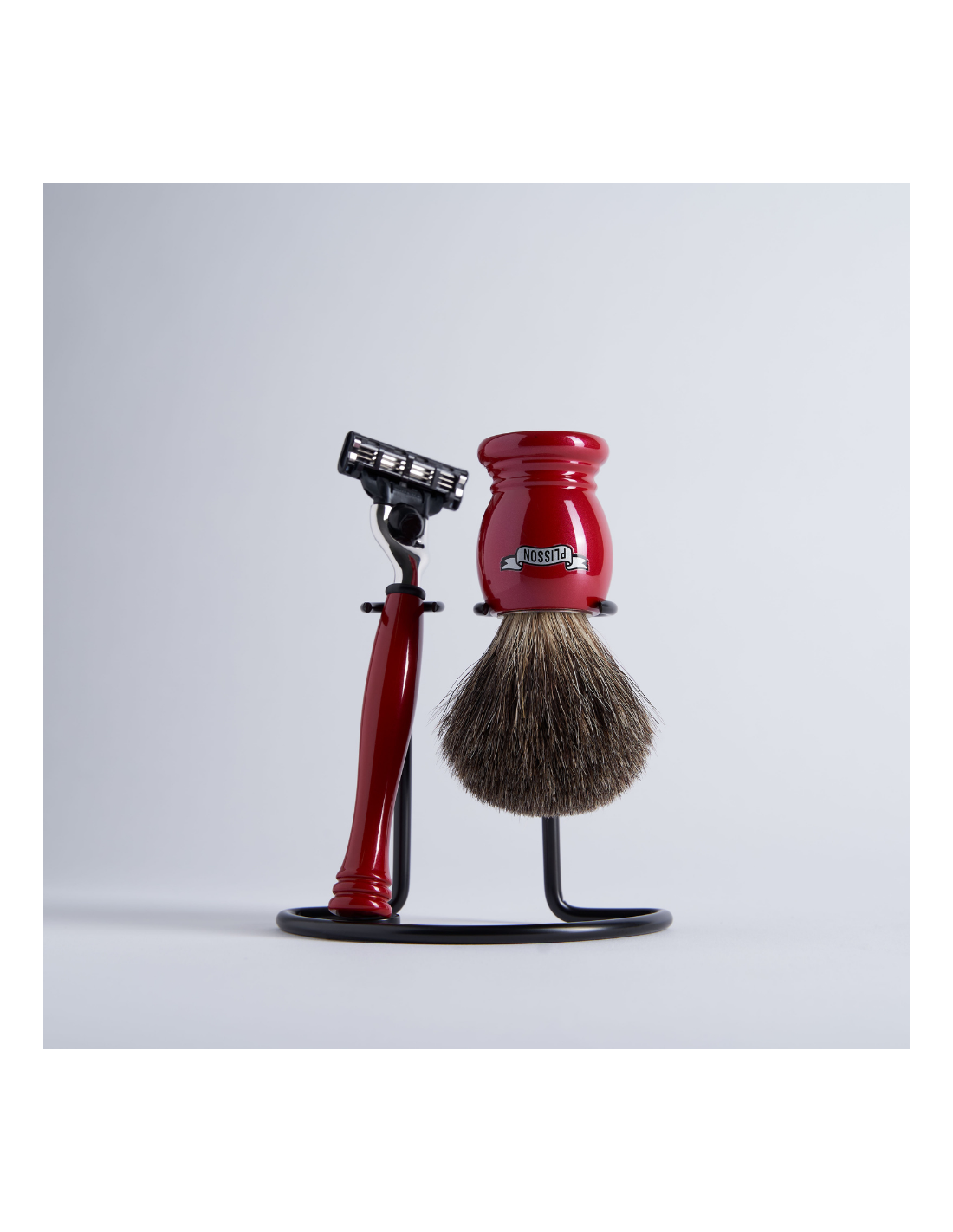 Bel ensemble de la gamme Essentiel, idéal pour s'initier au rasage traditionnel. Le set est constitué d'un magnifique blaireau en taille 12, la plus utilisée, avec le manche classique en acétate et une garniture en pur blaireau gris de Russie, ferme et tonifiant pour la peau. Il est accompagné par son rasoir assorti, équipé d'une tête Mach3 de Gillette, précise et efficace. Le tout est mis en valeur par le serviteur adapté, en acier noir, nécessaire pour un bon rangement de vos accessoires de rasage.