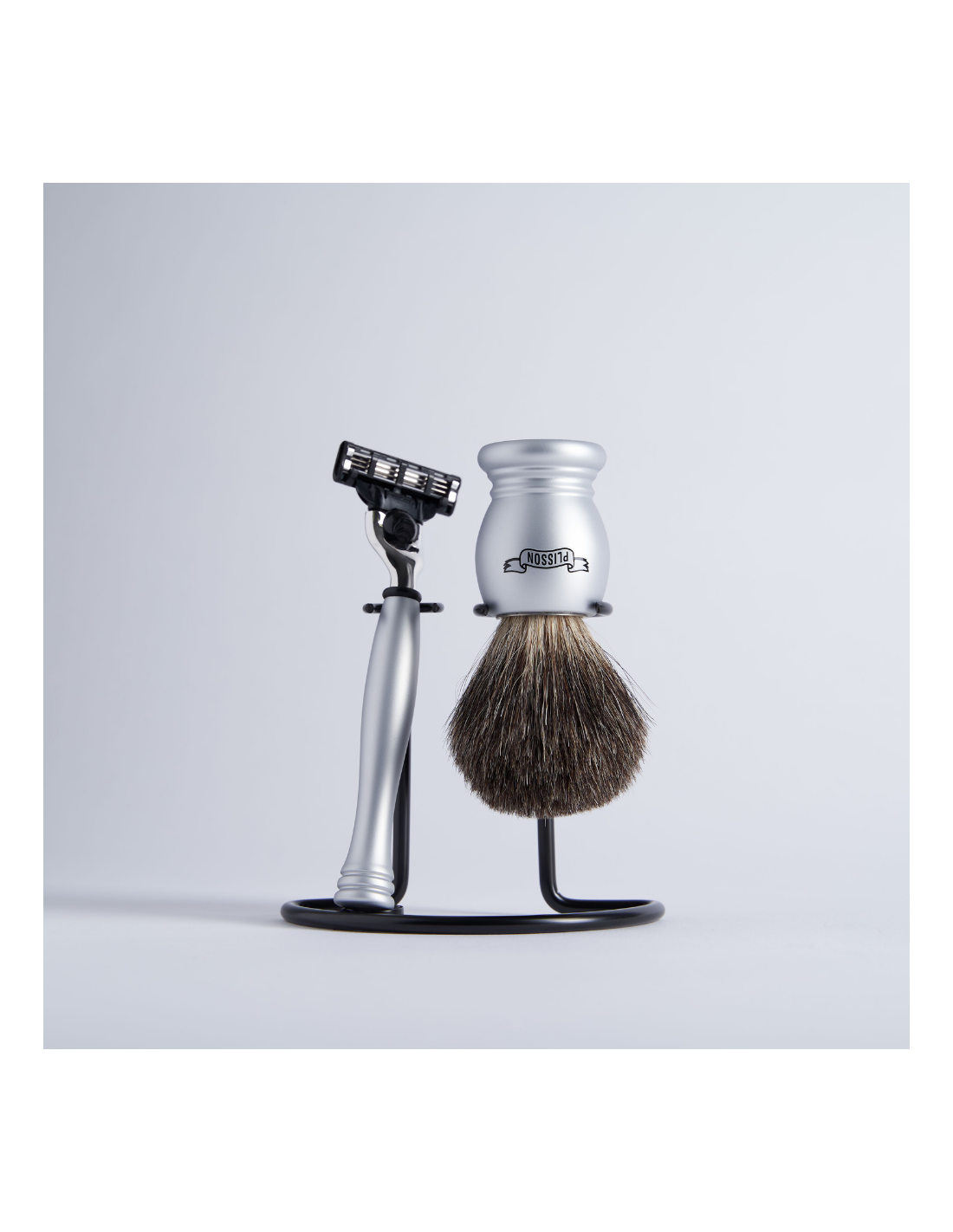 Bel ensemble de la gamme Essentiel, idéal pour s'initier au rasage traditionnel. Le set est constitué d'un magnifique blaireau en taille 12, la plus utilisée, avec le manche classique en acétate et une garniture en pur blaireau gris de Russie, ferme et tonifiant pour la peau. Il est accompagné par son rasoir assorti, équipé d'une tête Mach3 de Gillette, précise et efficace. Le tout est mis en valeur par le serviteur adapté, en acier noir, nécessaire pour un bon rangement de vos accessoires de rasage.