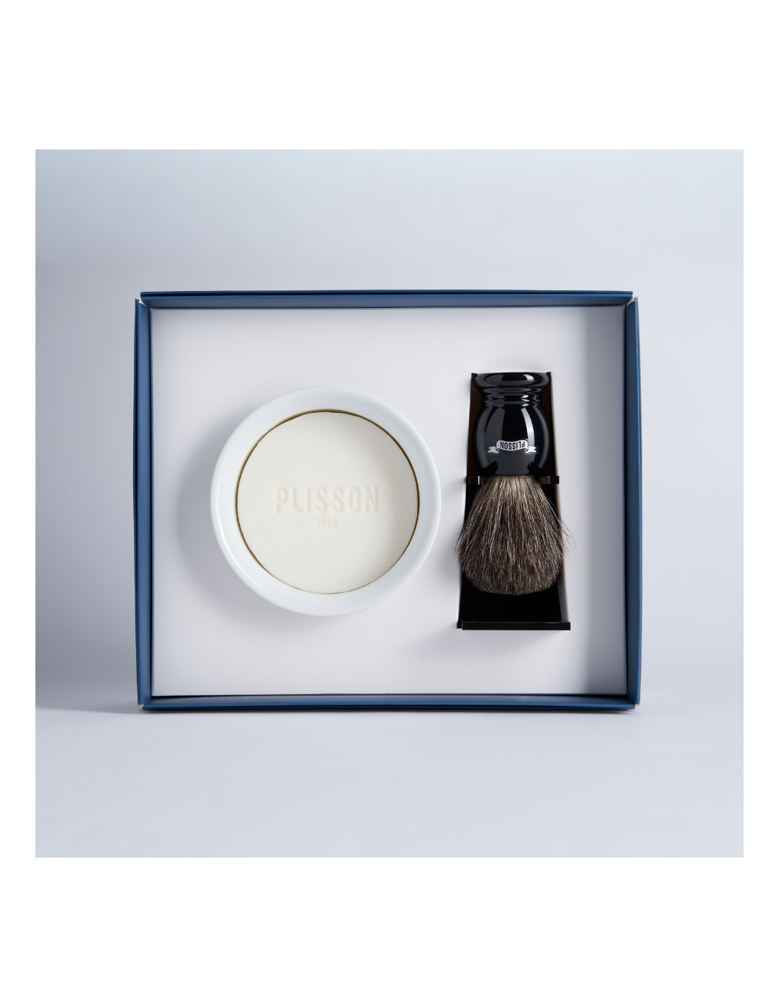 Manche traditionnel en résine disponible en différent coloris. Support en plexi et bol en porcelaine de Limoges avec son savon à barbe.