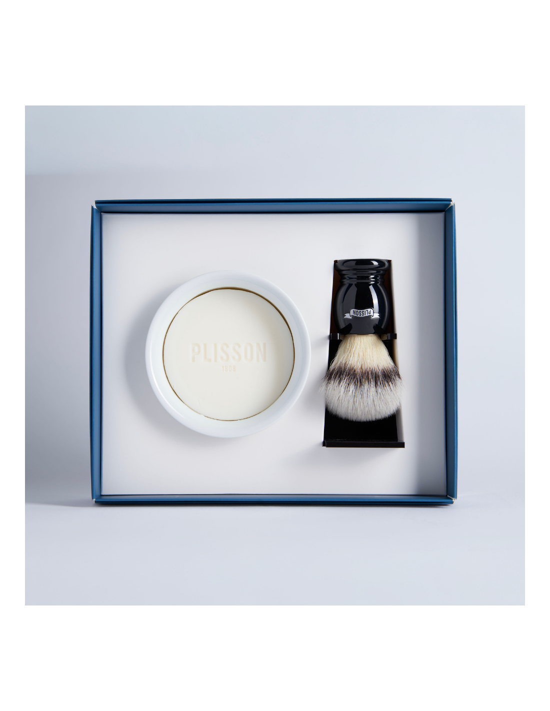 Ce modèle est proposé en taille 12, standard, bien adaptée à un usage quotidien avec son support adapté en plexi-cristal pour un rangement « Tête en bas », indispensable pour un bon séchage, et un bol en porcelaine de Limoges avec son savon à barbe.