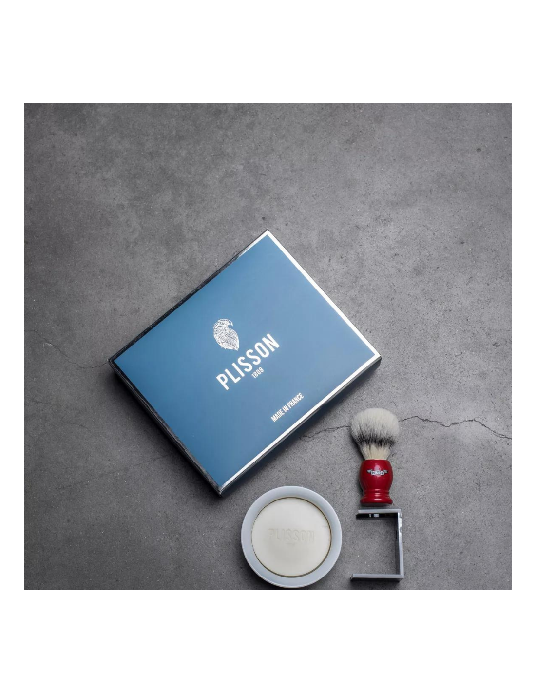 Ce modèle est proposé en taille 12, standard, bien adaptée à un usage quotidien avec son support adapté en plexi-cristal pour un rangement « Tête en bas », indispensable pour un bon séchage, et un bol en porcelaine de Limoges avec son savon à barbe.