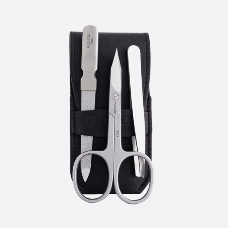 Ensemble à manucure composé des ciseaux à ongles, lime à ongles et pince à épiler en acier inoxydable, rassemblés dans un étui en cuir véritable.